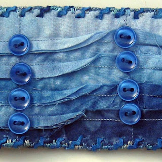 (Just kidding about the bending. I photographed the bracelet on an old envelope.) I used five shades of gradation dyed fabric. The seam allowances are pushed in alternating directions, up and down, and held in place by buttons.I backed the pieced strip with a single layer of embossed felt (sold in sheets at the craft store).