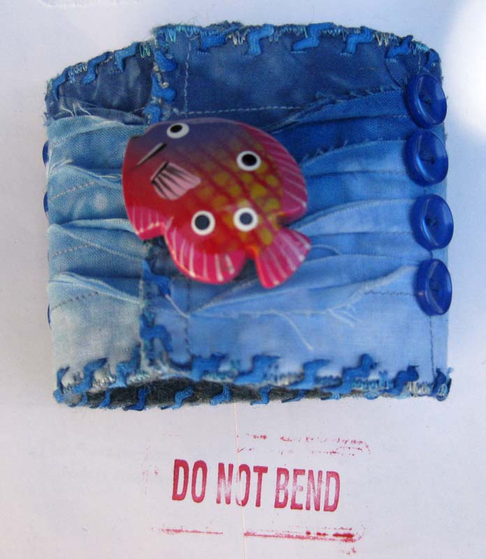 On extremely rare occasions, i.e. only this one time, I go for backwards! Below is the 2.75" x 9" quiltlet above, closed, as a wrist cuff (napkin ring, paperweight, etc). The fish is actually a wooden button cover, with a button underneath.
