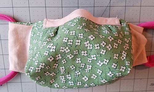 In the next mask, the pale pink fabric strip on top holds the wire. This design has one main body - the green floral in this photo - and two side panels, in pale pink.