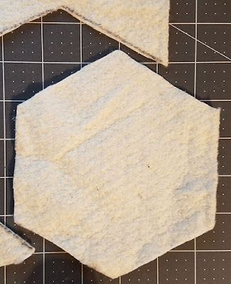 4. Don't cut it apart yet! First we'll create a full-size backing with turned edges. For the back, I suggest you use a fabric that won't show cappuccino, croissant, or french fry stains. Lay the entire hexagon on the wrong side of your backing fabric.