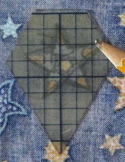 Fussy cutting means precise placement of the print that appears on the shape. In my hotel room, I mostly eyeballed it, which takes time and doesn't work perfectly. Once home, I solved the problem by making myself one plastic template for each different shape. Below, I'm tracing a cardstock jewel template onto gridded plastic.